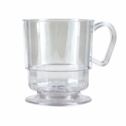 These disposable clear plastic coffee cups are perfect for any parties, food services or just as everyday use. They are best used for serving coffee, tea, hot chocolate, and other hot beverages. These cups include a footed base and flat facets to coordinate with other various Deluxe & Elegance plates, bowls & tumblers. Each pack contains 10 plastic cups that measure 3.35″ tall and have a rim diameter of 2.95″