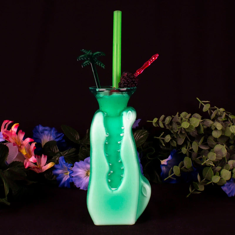 Whip up some frozen fruity cocktails in this Green Gator Party Yard cup for your next social gathering. This gator cup is made of durable plastic and features an embossed design of an alligator’s head displaying its wavy shaped mouth and small teeth down the sides of the cup. It also has a small curved hump towards the bottom with the gator’s eyes. the capacity of this cup is 27 ounces and measures 7.25″ in length and has a 2.5″ rim diameter.