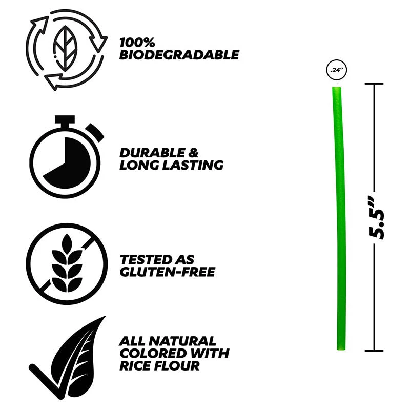 Made of rice flour, tapioca starch, and plant based ingredients that are flavorless in beverages and tested as gluten-free. Meaning that they are not only good for you but also for the environment. 100% biodegradable breaks down naturally, unlike paper and plastic straws. Designed to last 30+ minutes in cold beverages. They make a great alternative to disposable plastic and paper straws so buy a box today and give your patrons a fun new drinking experience! Measures 5.5”
